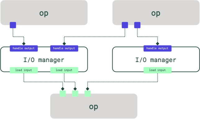 For ops, each op output can have its own I/O manager, or multiple op outputs can share an I/O manager. The I/O manager that's used for handling a particular op output is automatically used for loading it in downstream ops.