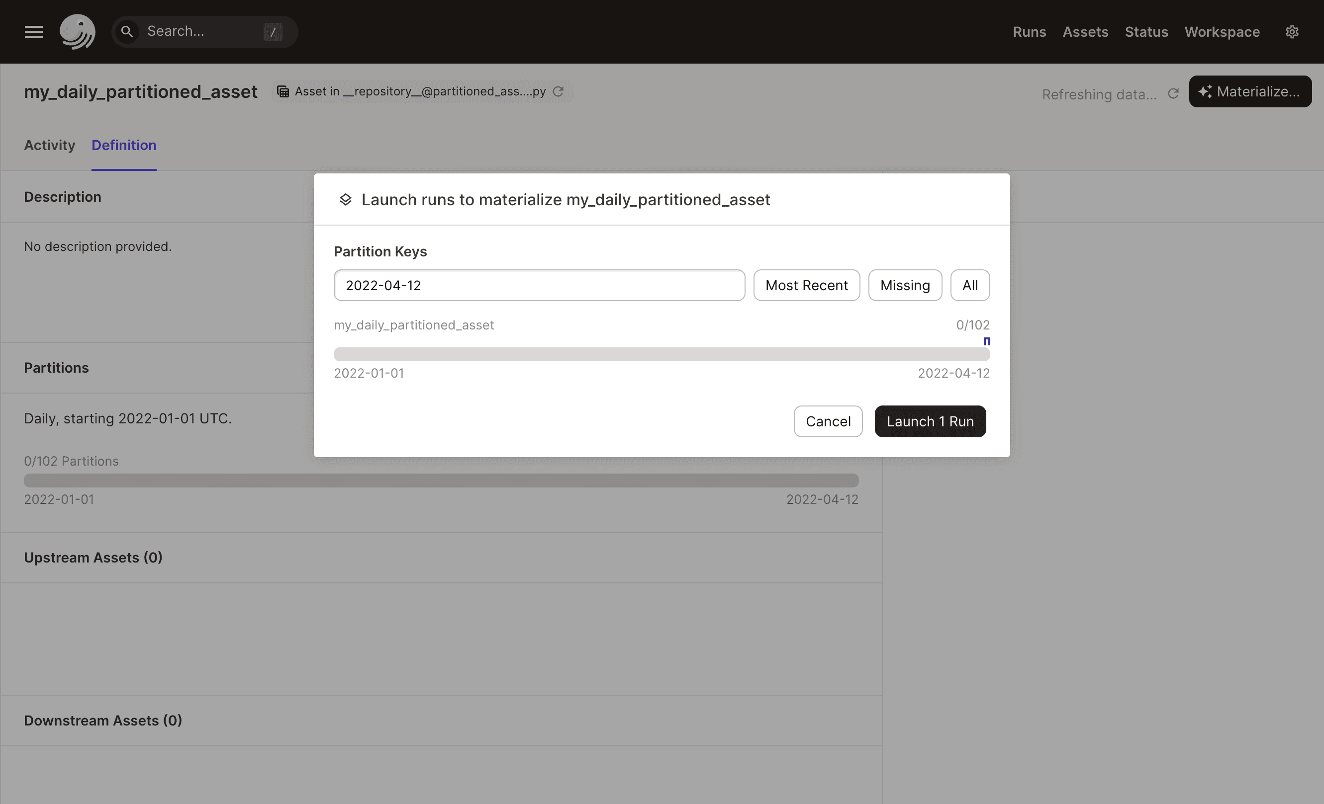 The following image shows the Launch runs dialog on an asset's Details page, where you'll be prompted to select a partition to materialize: